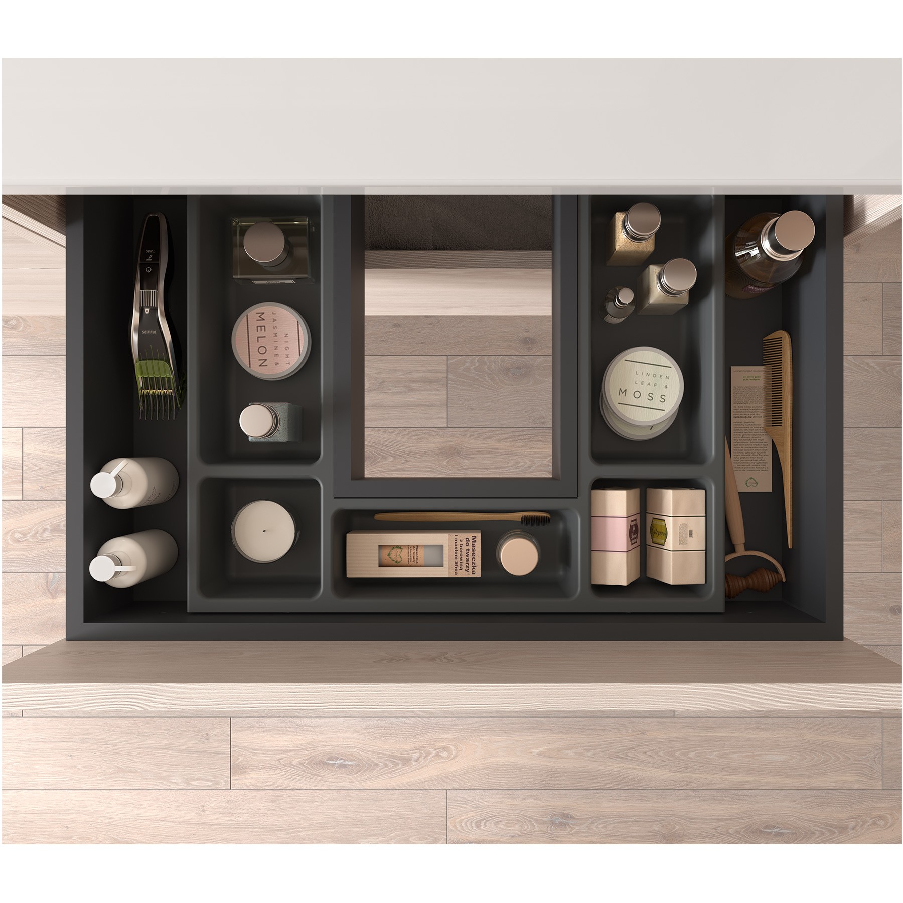 Esta serie de muebles de baño ofrece la posibilidad de contar con todo en orden gracias al organizador de cajón incluido de serie y un funcionamiento mejorado con el sistema de apertura push de Hettich.