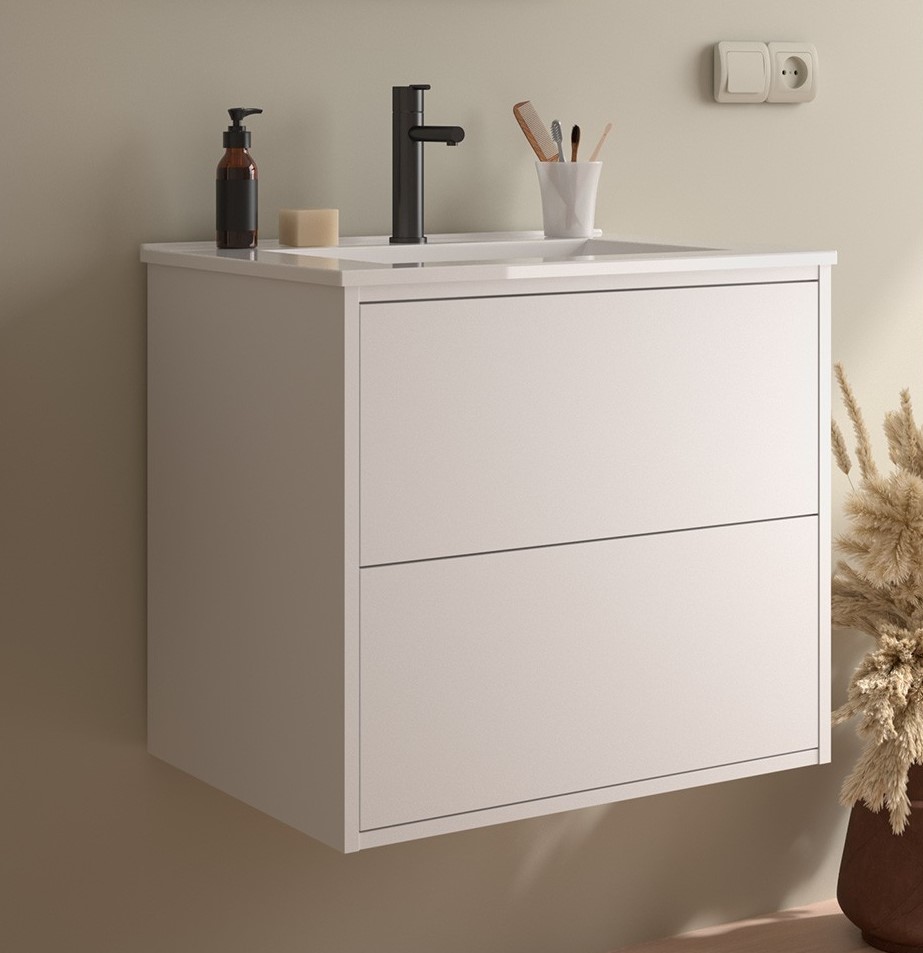 - Muebles de baño de cajones con guías ocultas, cierre amortiguado y regulación en altura.
