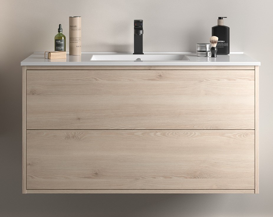 - Muebles de baño de cajones con guías ocultas, cierre amortiguado y regulación en altura.