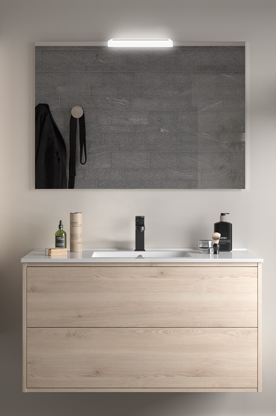 El conjunto incluye mueble de baño, lavabo integrado y espejo con aplique LED.