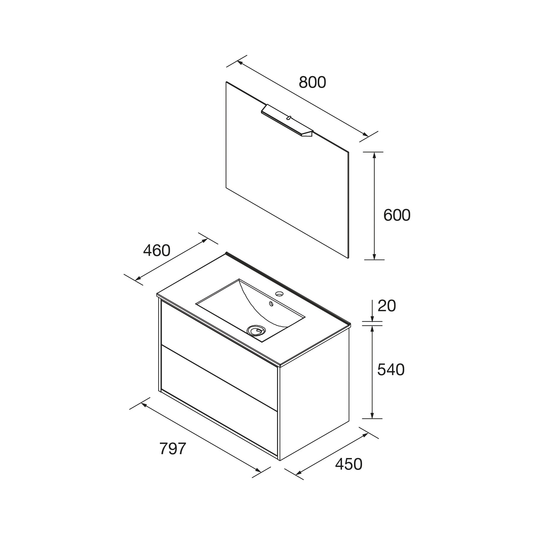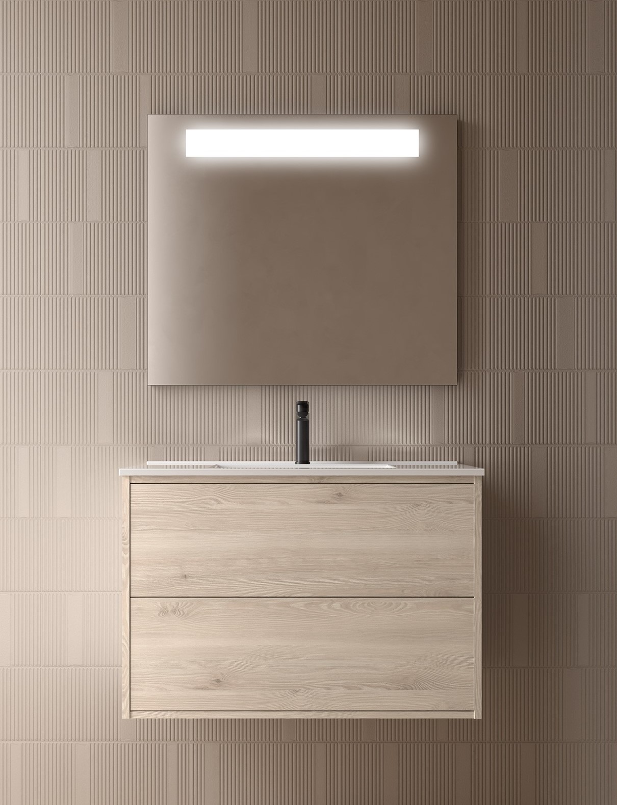 El conjunto incluye mueble de baño, lavabo integrado y espejo con aplique LED.