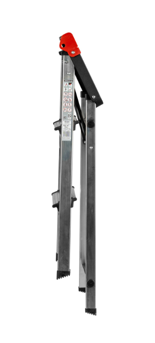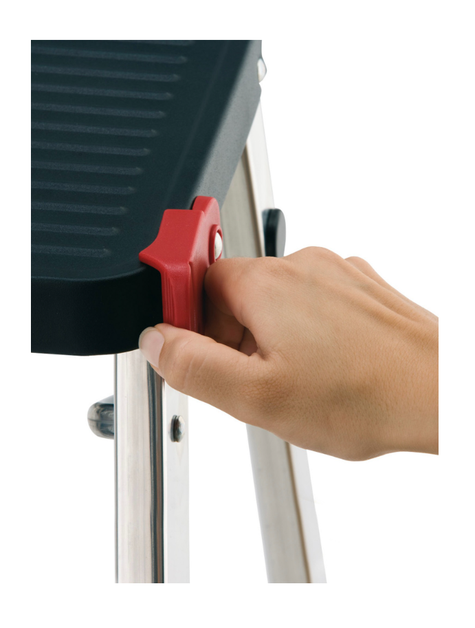 - Seguro para evitar el plegado involuntario, amplia superficie de subida, peldaños y plataforma antideslizantes.