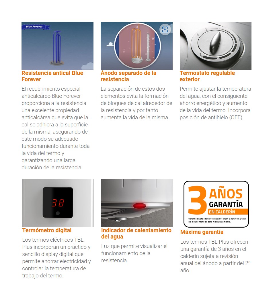 - Resistencia con recubrimiento especial anticalcáreo BLUE FOREVER que evita la adherencia de la cal.