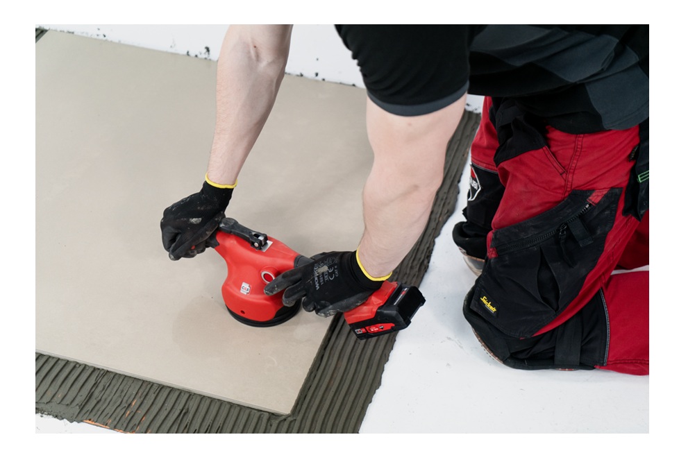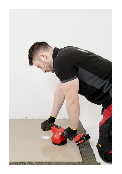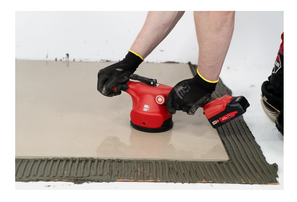 La combinación de la ventosa y del vibrador permite trabajar en puntos y situaciones concretas, como elevar, ligeramente, una baldosa que haya bajado demasiado, al vibrarla, y necesitemos recuperar su posición. Esta doble función, de la ventosa y del vibrador, reduce la posibilidad de generar huecos sin adhesivo bajo la baldosa al levantarla.